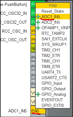 In the Configuration pane, expand Analog → ADC1 and and set IN5 to IN5 Single-ended. PA0 should turn green.